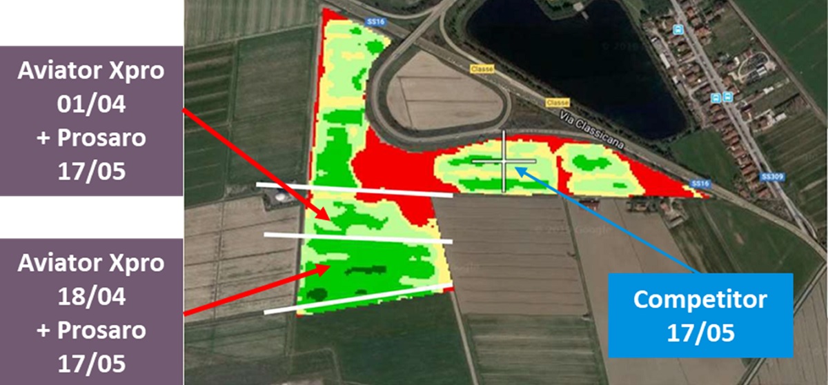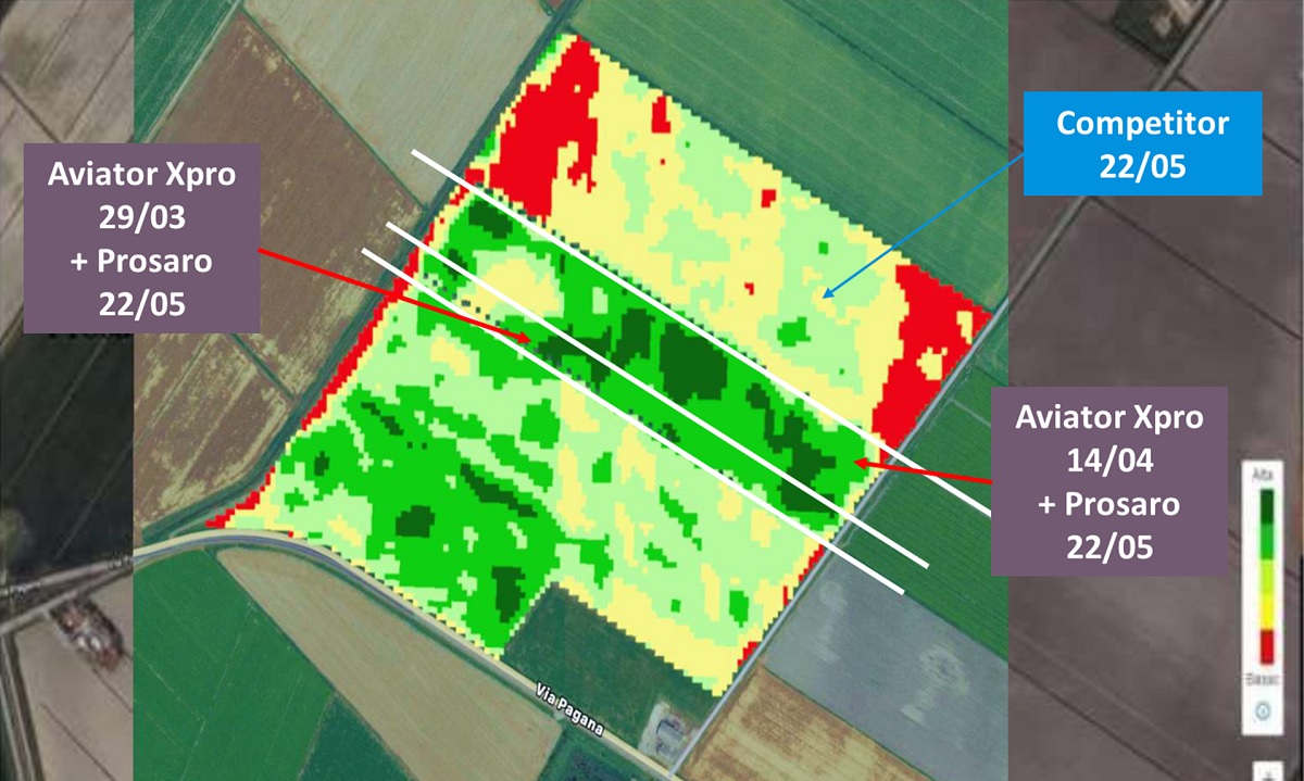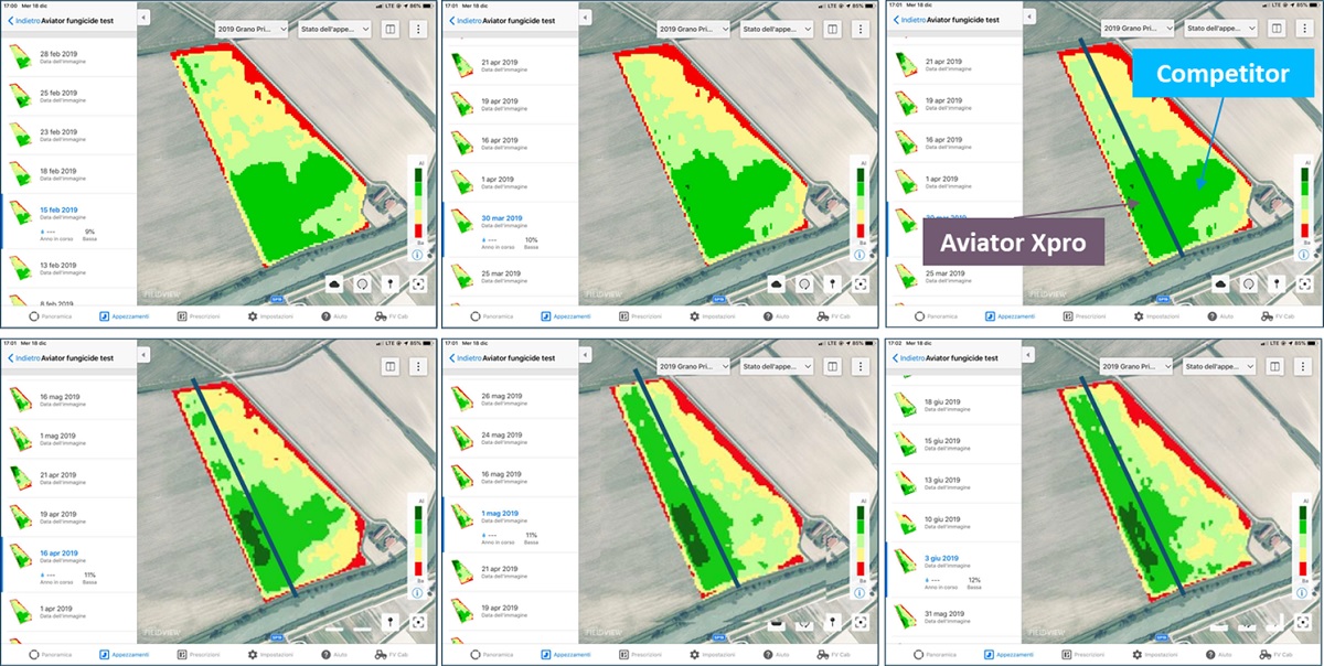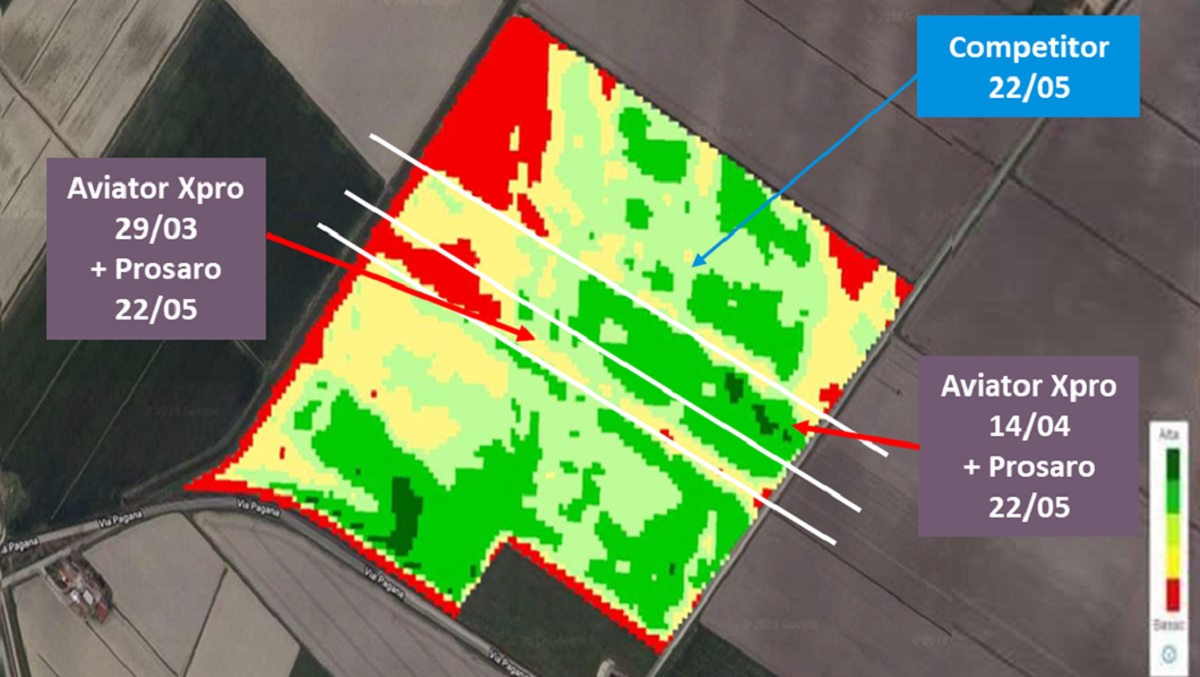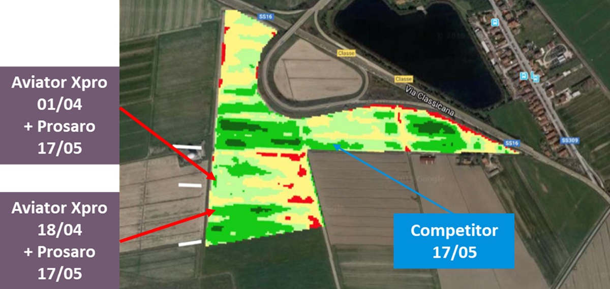 Dai dati satellitari resi disponibili tramite FieldView risulta evidente l'efficacia di Aviator Xpro, utilizzato da solo o in strategia con Prosaro, nel difendere i cereali dalle malattie fungine, ma anche incrementando le produzioni