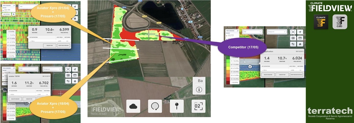 “Quando guardando il campo l'occhio umano non nota differenze, Climate FieldView riesce invece a percepire le difformità di vigoria che poi si ripercuotono nel raccolto”, sottolinea Ridolfi. “Dopo aver impiegato Aviator Xpro si poteva notare la maggiore vigoria della coltura nei campi trattati. Ed è incredibile la coincidenza quasi perfetta tra la mappa di vigore e quella di produzione generata dalla trebbia: alle aree maggiormente in salute coincide anche una produttività più elevata”.