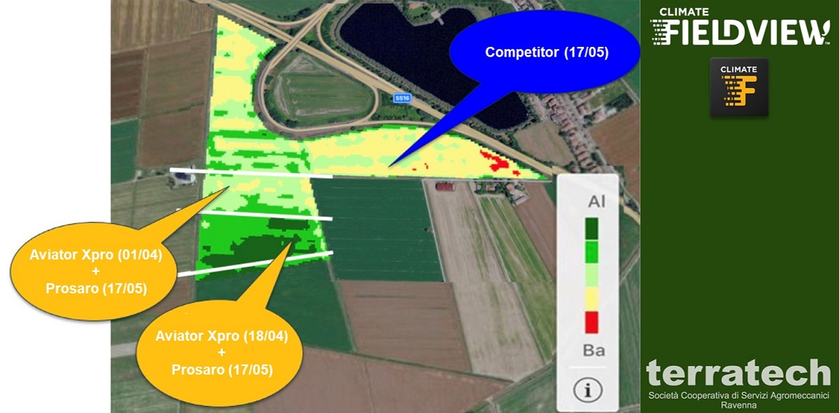 È anche possibile posizionare il trattamento con Aviator Xpro nell'intervallo di tempo tra levata e spigatura, come fatto da Ridolfi. “Abbiamo applicato Aviator Xpro con un trattamento dedicato nel mese di aprile”, spiega il direttore generale della cooperativa Terratech.