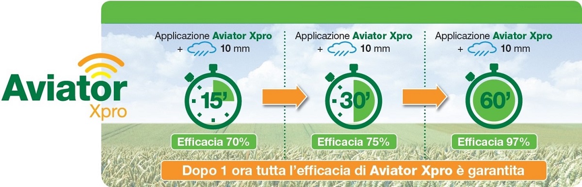 In caso di pioggia, l'efficacia di Aviator Xpro è garantita al 97% ad un'ora dall'applicazione, percentuale che scende al 75% nel caso in cui l'evento atmosferico si verifichi solo dopo 30 minuti dall'irrorazione.