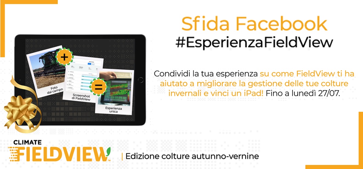 Condividi entro le 17.00 del 27/07 la tua esperienza con FieldView, inviando un messaggio privato alla pagina Facebook di FieldView Italia includendo: una breve descrizione di come FieldView ti ha aiutato a migliorare la gestione delle tue colture, uno screenshot di FieldView e un'immagine reale del campo.