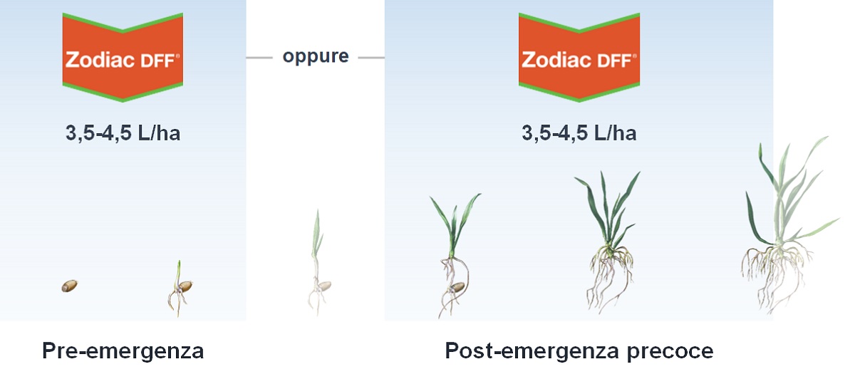 Zodiac DFF è l'erbicida selettivo ad applicazione autunnale per il controllo delle principali infestanti annuali graminacee e dicotiledoni a base di Diflufenican e Clortoluron.